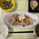献立 鶏肉のすき焼き風煮さつま芋の天ぷらオクラの梅和え味噌汁ご飯