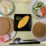 献立 オムレツツナサラダオニオンスープパンケーキ牛乳紅茶果物