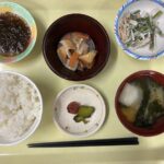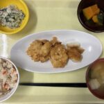 献立 鶏天ゆず風味南瓜の煮付ほうれん草の白和え味噌汁五目御飯