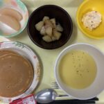 献立 ジャーマンポテト卵サラダコーンポタージュスープパン牛乳紅茶りんごのコンポート