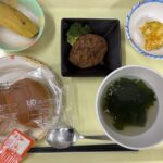 献立 ハンバーグかぼちゃサラダわかめスープパン牛乳紅茶果物