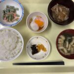 献立 豚肉の甘辛煮いんげんのマヨ和え温泉卵味噌汁ご飯漬物