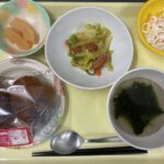 献立 キャベツのカレー炒めスパゲティサラダわかめスープパン牛乳紅茶りんごのコンポート