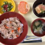 献立 豚バラ甘辛丼揚げ出し豆腐オクラの和え物味噌汁みかんゼリー