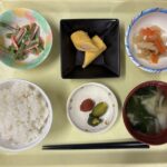 献立 カニ巻き卵さつま揚げの煮物いんげんのマヨ和え味噌汁ご飯漬物