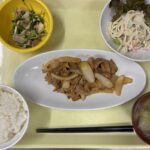 献立 ポークチャップ豆苗とベーコン炒め物スパゲティサラダ味噌汁ご飯
