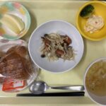 献立 きのこソテー卵サラダコンソメスープパン果物牛乳紅茶