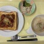 献立 ごぼうサラダわかめスープピザトースト牛乳紅茶