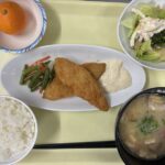 献立 白身魚フライマカロニサラダ豚汁ご飯フルーツ