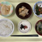 献立 豚肉と厚揚げの煮物春菊のお浸しなめたけおろし味噌汁ご飯漬物