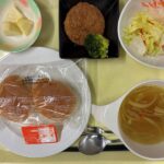 献立 ハムカツ野菜サラダコンソメスープパン紅茶牛乳果物