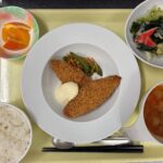 献立 サーモンフライ和風サラダトマトスープご飯フルーツ