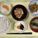 献立 豚肉と厚揚げの煮物いんげんのピーナッツ和え温泉卵味噌汁ご飯漬物