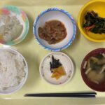 献立 鶏ごぼう春菊のお浸しじゃこおろし味噌汁ご飯漬物