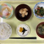 献立 里芋のそぼろあんかけほうれん草のピーナッツ和え温泉卵味噌汁ご飯漬物