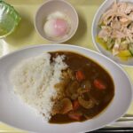 献立 カレーライス温泉卵蒸し鶏のサラダマスカットゼリー