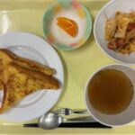 献立 ウインナーと野菜のケチャップ炒めオニオンスープフレンチトースト牛乳紅茶果物