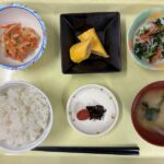 献立 カニ巻き卵切干大根の煮付小松菜のじゃこ和え味噌汁ご飯漬物
