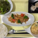 献立 鶏肉のピリ辛炒めシュウマイチョレギサラダ中華スープご飯