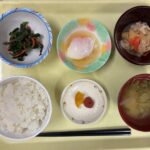 献立 豚肉と厚揚げの煮物ほうれん草のおかか和え温泉卵味噌汁ご飯漬物