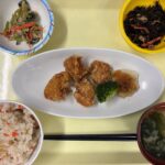 献立 ぽんからひじき煮小松菜のツナ和え味噌汁五目御飯