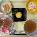 献立 スクランブルエッグスパゲティサラダオニオンスープパン牛乳紅茶りんごのコンポート