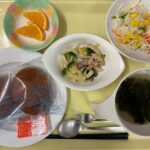 献立 ブロッコリーのマヨネーズ炒めコールスローサラダわかめスープパン牛乳紅茶果物