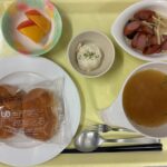 献立 きのこソテーポテトサラダオニオンスープパン牛乳紅茶果物
