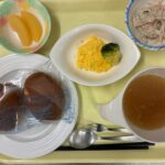 献立 スクランブルエッグごぼうサラダオニオンスープパン牛乳紅茶りんごのコンポート