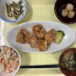 献立 ぽんから高野豆腐の含め煮いんげんのマヨ和え味噌汁五目御飯