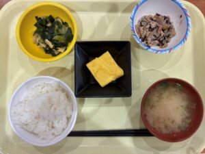| 4/3(金) | 鶏ごぼう オクラのごま和え 温泉卵 味噌汁 ご飯 漬物 |