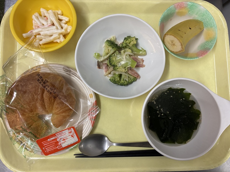 2025年10月16日 / 最終更新日時 : 2025年10月16日 caroline 今日の献立 10月16日(木)の朝食 献立 ブロッコリーのマヨネーズ炒めマカロニサラダわかめスープパン牛乳紅茶果物